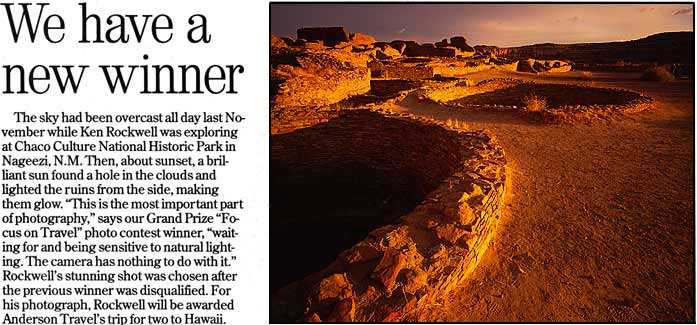 The previous contest "winner" was disqualified since he just put a coffee-table travel book into a color copier and submitted that copy of an image very similar to my image here. When the newspaper published the image their phones lit up with people saying "baloney, that photo is on the cover of a book I just bought at the big warehouse store" and thus the joker was disqualified.