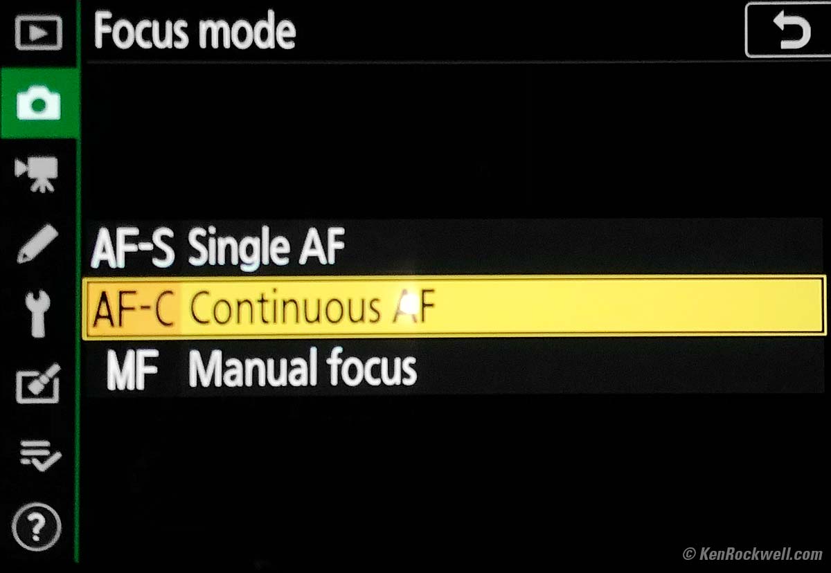 Distance-Axis AF Modes AF-S (single and lock), AF-S (continuous tracking) with predictive tracking. "Full-time" AF-F in movie mode only. Manual focus. Electronic rangefinder.